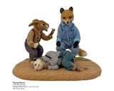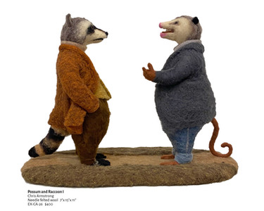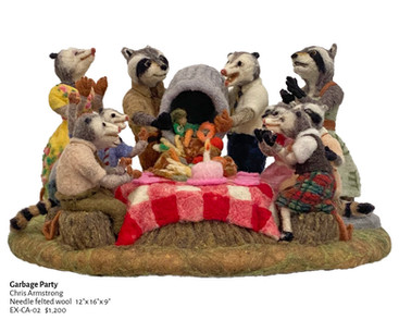 Thus, Chris Armstrong's business, Whippoorwool, was born. Those who attended his shows began to see a world of whimsical animals wearing clothes and interacting with one another in human experiences: bunnies at a cookout, cats sunbathing and getting their hair done, possums and raccoons attending a birthday party, and mice playing piano while frogs dance to the music. His work didn't start out that interactive, though—he says it was when he decided to incorporate wire into his sculptures when the real magic started to happen and the characters came to life.