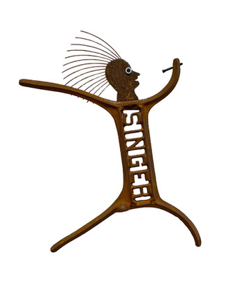 Jim Shores' curious menagerie of patinaed metal is on display at Kentuck's Museum Gallery from May 5, 2022 to July 4, 2022. Shores' work truly embodies the spirit of folk art and strums the nostalgic strings of our hearts. Rusted Singer sewing machine pieces have been transformed into dancing figures and old Buick parts into lively faces. There is an aura of playful patriotism that weaves its way through the show.