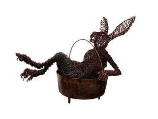 Though the viewer has surely not seen anything quite like Josh Cote's artwork, many of the pieces include antique found objects that evoke a sense of child-like nostalgia. Bunnies playing with bicycles, pedal cars, and tricycles are scattered around the gallery and are admired by fans both young and old. Ever since his childhood stuffed rabbit, Peter, was left behind in a move, Josh honors his friend by bringing him to life in the medium of wire. Many rabbits have come and gone from his life, but the memory of Peter reminds him—and in turn, the viewer—to never grow up.