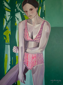 Pulling from images she may find--an old photo, an ad, or one of her photographs--Kathryn then completes a sketch, tosses the photo away, and paints intuitively. She used to work primarily with blues and greens, but has more recently been studying color more intensely to create palettes that are dramatic and unusual--colors that almost become electric when placed together. Kathryn has just completed a Summer Beach series, which is a collection of ladies in swimwear. Her main focus was working with color combinations which would be the most impactful.