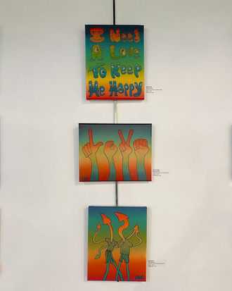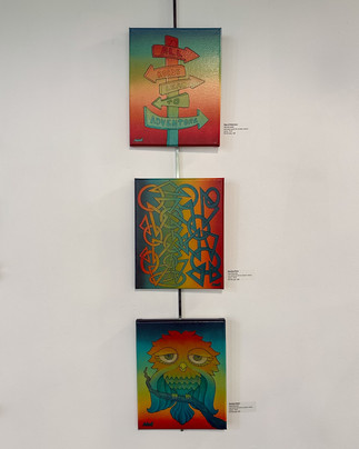 "I believe my art performs best when it subtly blends many styles, influences, and media into something unique for that moment. A lot of my work uses themes of nature and historical popular culture references. The mediums I have been using most are acrylics, paint markers, and spray paint. I also enjoy making sculpture. I usually make those out of sculpey or foam and sometimes adhere them to found objects. My main process starts by writing down ideas throughout the day and later revising them into drawings. Depending on the idea in the drawing, I then choose a medium to start working with. When it all goes well, I finish with a fully realized illustration, painting, or sculpture."