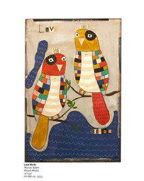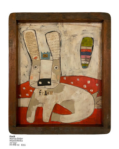 Marian’s pieces rely on exactly 9 steps from start to finish. First, wooden boards are cut & sanded, then vintage papers are adhered to the board. More papers are added to provide depth to her finished pieces. Once this is complete, she layers her pieces with a brown wash, followed by a gesso wash. Next up, Marian paints her scenes on the prepared canvas with acrylic paint and outlines the final design with pencil & charcoal. Finished pieces are set for 10 hours to allow the charcoal to cure, and as a final step Marian wax paints each piece. 60% of her pieces are made from recycled materials, some of which pre-date the 1970s. Besides drawing inspiration from family life and personal stories, Marian finds many of her ideas in the stories & materials she collects while on the road. Her frames are often old screen-printing frames which she salvaged from a burned down warehouse. Collecting and incorporating these vintage elements adds the value of timelessness to her work which is integral to what Marian seeks to express in her art.