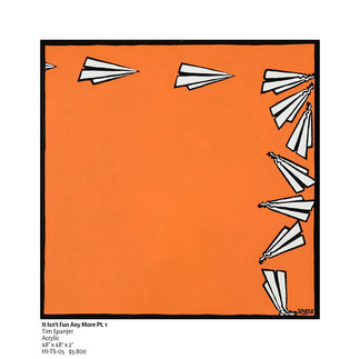 It Isn't Fun Anymore is one of the pieces that is strikingly simple--a several paper airplanes on a flat orange background. Perhaps, this piece will remind the viewer of paper airplane battles in elementary school. However, there is a deeper reference for Tim inspired by The End of Something by Ernest Hemingway. In Hemingway's short story, a young couple ends their relationship when Nick declares, "It isn't fun anymore." (citation). This bold, simple composition does more than remind us of the fun we used to have--it also serves as a warning of what happens when the fun is no longer present.